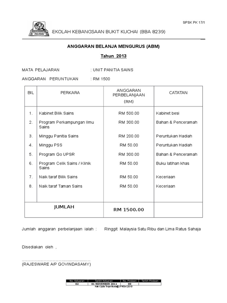Anggaran Perbelanjaan Panitia Sains Pdf Document