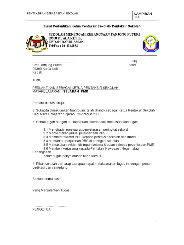 Lampiran 4b Surat Plantikan Ketua Pentaksir Sekolah