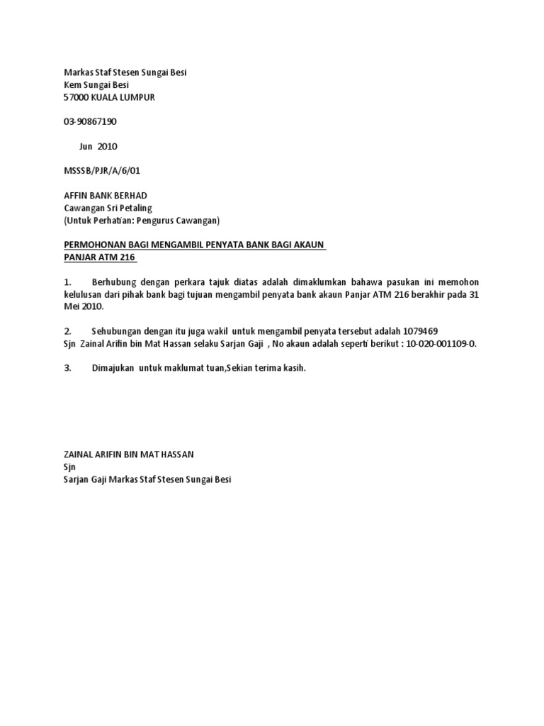 Contoh Surat Permohonan Penyata Bank