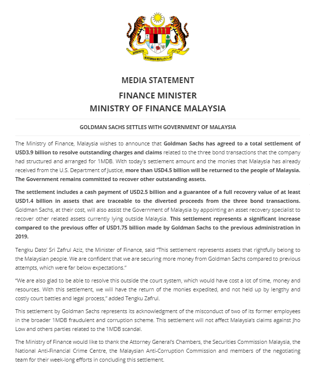 Ben Lucas On Twitter Breaking Malaysia S Ministry Of Finance Confirms Reuters Report That It Has Reached A Us 3 9 Billion Settlement With Goldman Sachs Over Its Role In The 1mdb Corruption Scandal Https T Co Nr9ujxb1wc