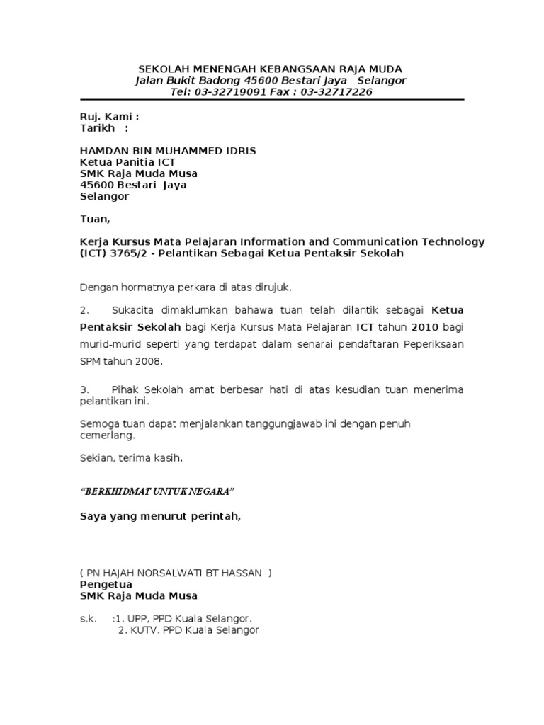 Surat Pelantikan Sebagai Ketua Pentaksir Pentaksir Pt3 2014